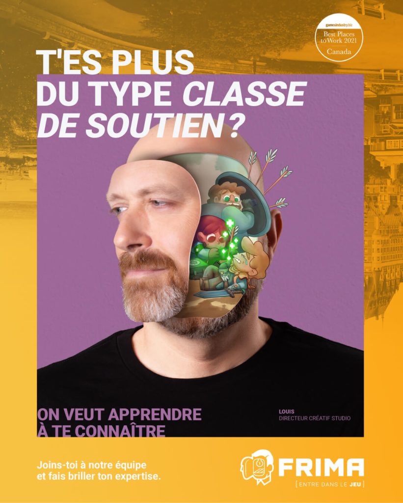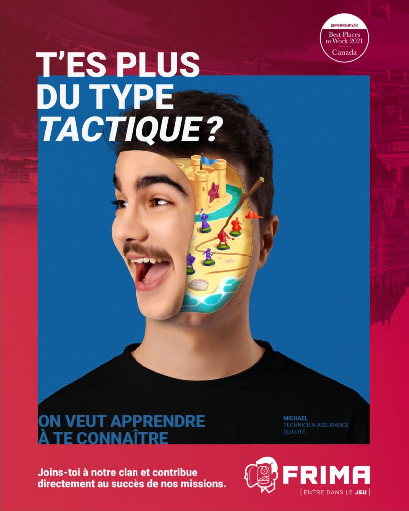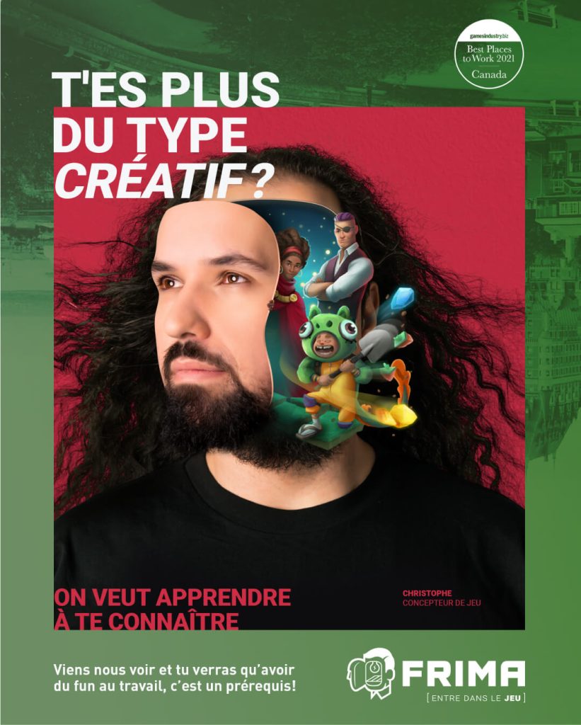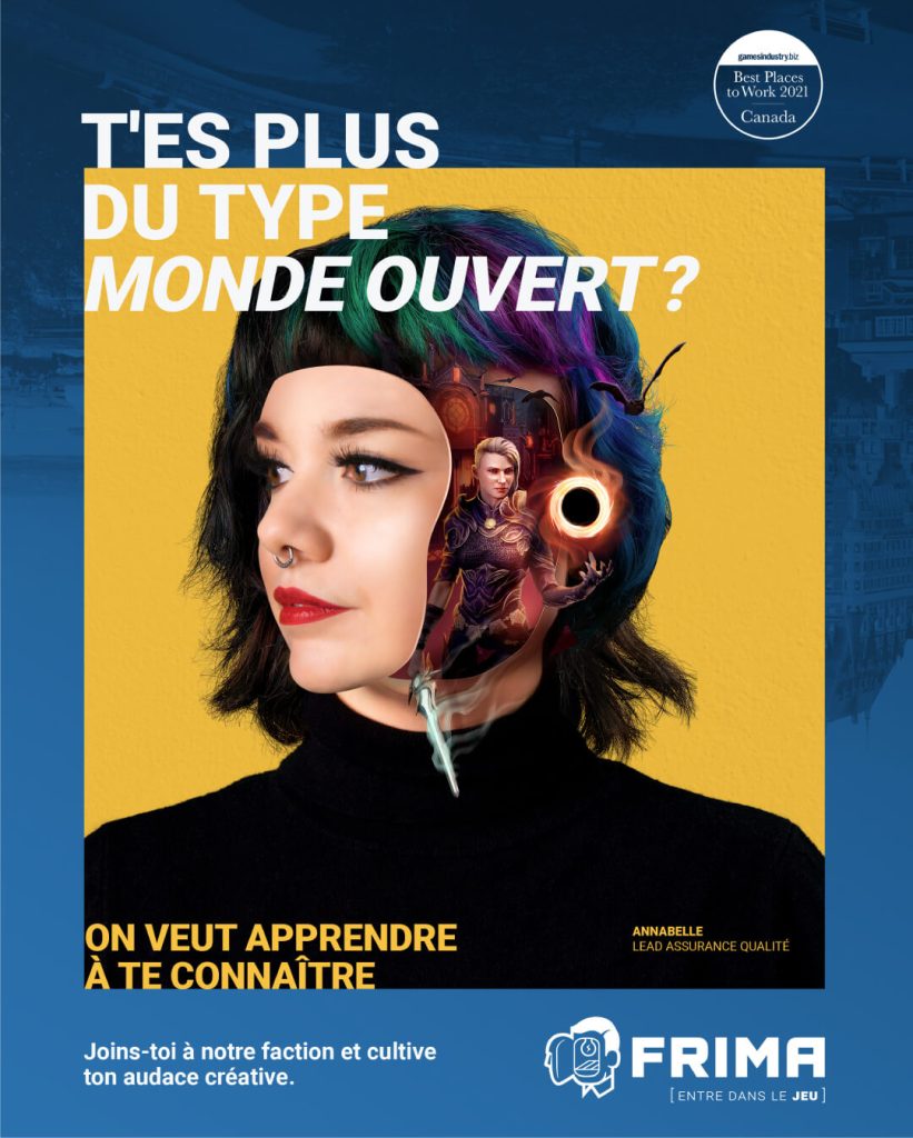 Frima Entertainment Studio today unveiled its new employer brand and reinforces its position as an employer of choice in the video game industry. Carried by the voice and shared values of its team, the new brand features five employee faces in a bold concept that propels us into the creative world of video games. The human and creative side of this campaign is also highlighted on the website while demonstrating the expertise and culture that Frima has developed over the past 20 years.